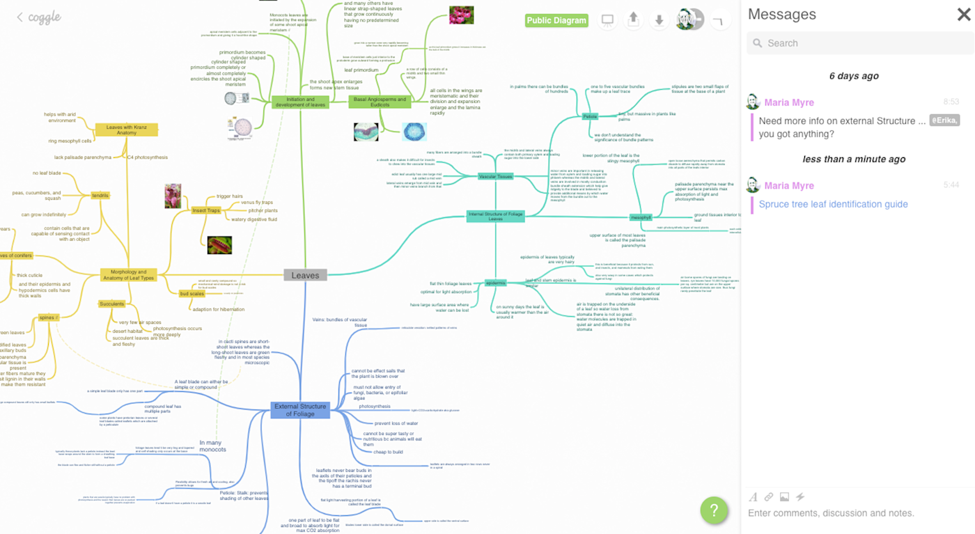 If you want to bounce some ideas off a colleague, you can go ahead and add them to your mind map, carry on a conversation in the messages sidebar, or go into full-screen presentation mode to take a step back and do more high-level ideation.